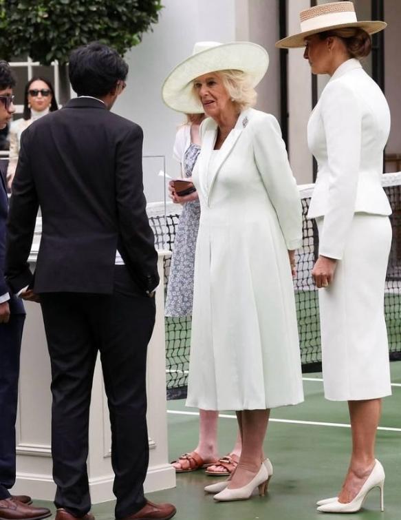 夫人的一身白色时装让人挑不出毛病,她还把长发挽起,草编礼帽是整套造型的点睛之笔。不得不说梅拉尼娅这身穿搭很用心,因为浅米色草编宽檐帽自带英式田园气质,既完美适配王室活动的礼帽传统,又以天然材质中和了白色套装的正式感,增添了几分清新松弛。