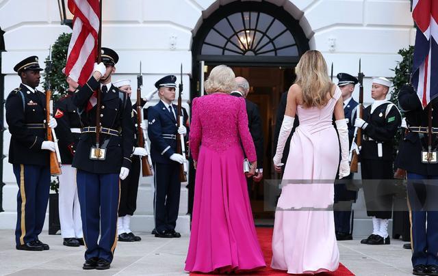 从画面可以看出,50+的梅拉尼娅穿一袭淡粉礼服裙同框英国王后卡米拉,这身浅粉礼服是抹胸款式,设计简约大方,纯色系面料还彰显高级感,看似扮嫩却优雅大气,既完美适配国宴礼仪,又以个人风格展现了美式优雅。